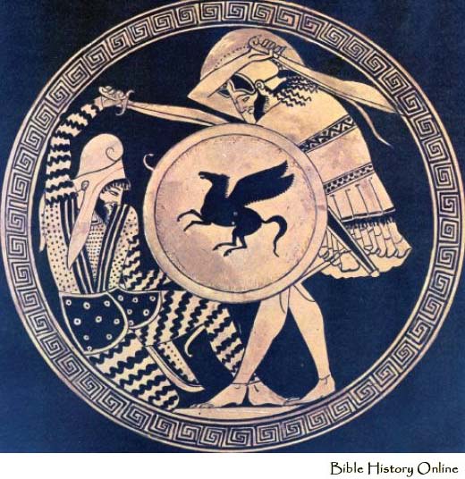 Ancient kylix showing detail of a Persian warrior and a Greek Hoplite fighting, 5 BC.