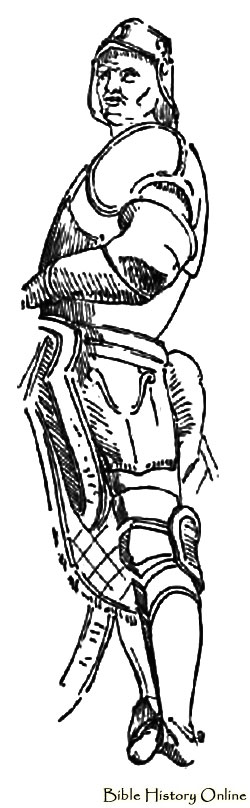 Italian armor of the end of the 15th century, from the equestrian statue of Bartolommeo Colleoni at Venice. This war harness is interesting on account of its enormous shoulder pieces, which are not fastened either to the arm-guards, to the back or to the breastplate, for between them may be seen a large surface of coat of mail.